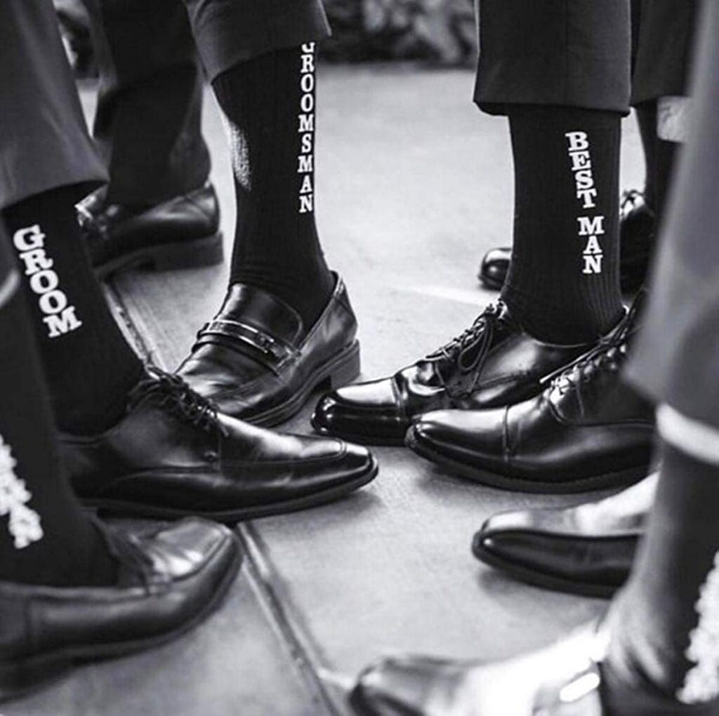 Every man I know loves socks. He may not admit it but deep down, he’s a fan. This set puts everyone in their place with wording that indicates the groom, groomsman, and best man. These socks add a fun twist to your big day with a whimsical touch that won’t be too distracting. (Distracting from you, of course. You’re the bride; it’s all eyes on you!)