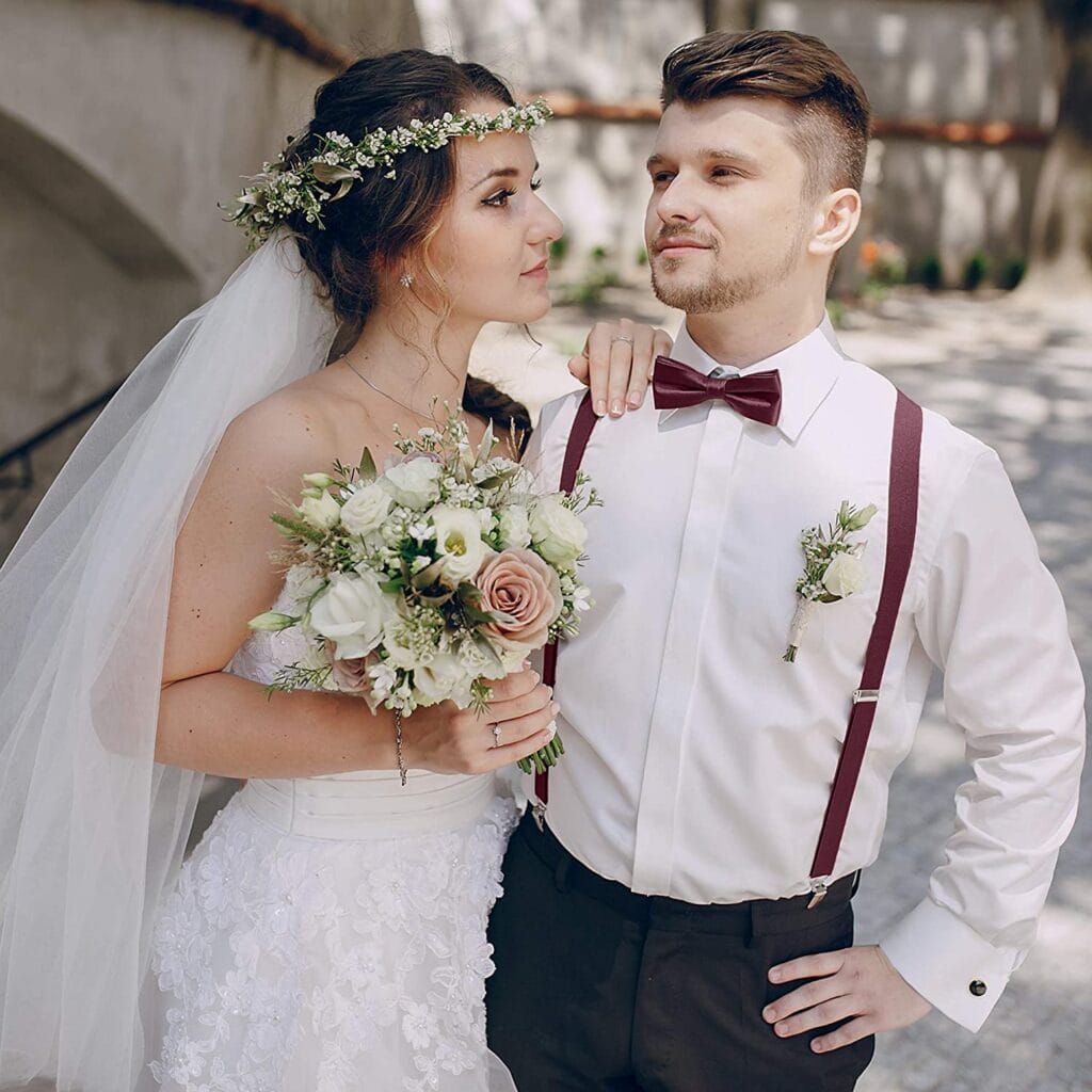 One of my favorite wedding looks is suspenders. Now, you can purchase them, with an accompanying bow tie, for less than $12 on Amazon. (Have you stopped looking at those expensive rentals yet?) This set comes in more than a dozen colors and can be bought as a single or in a pack of up to 12. Reusable, these feature sturdy metal clips and high-quality fabric.