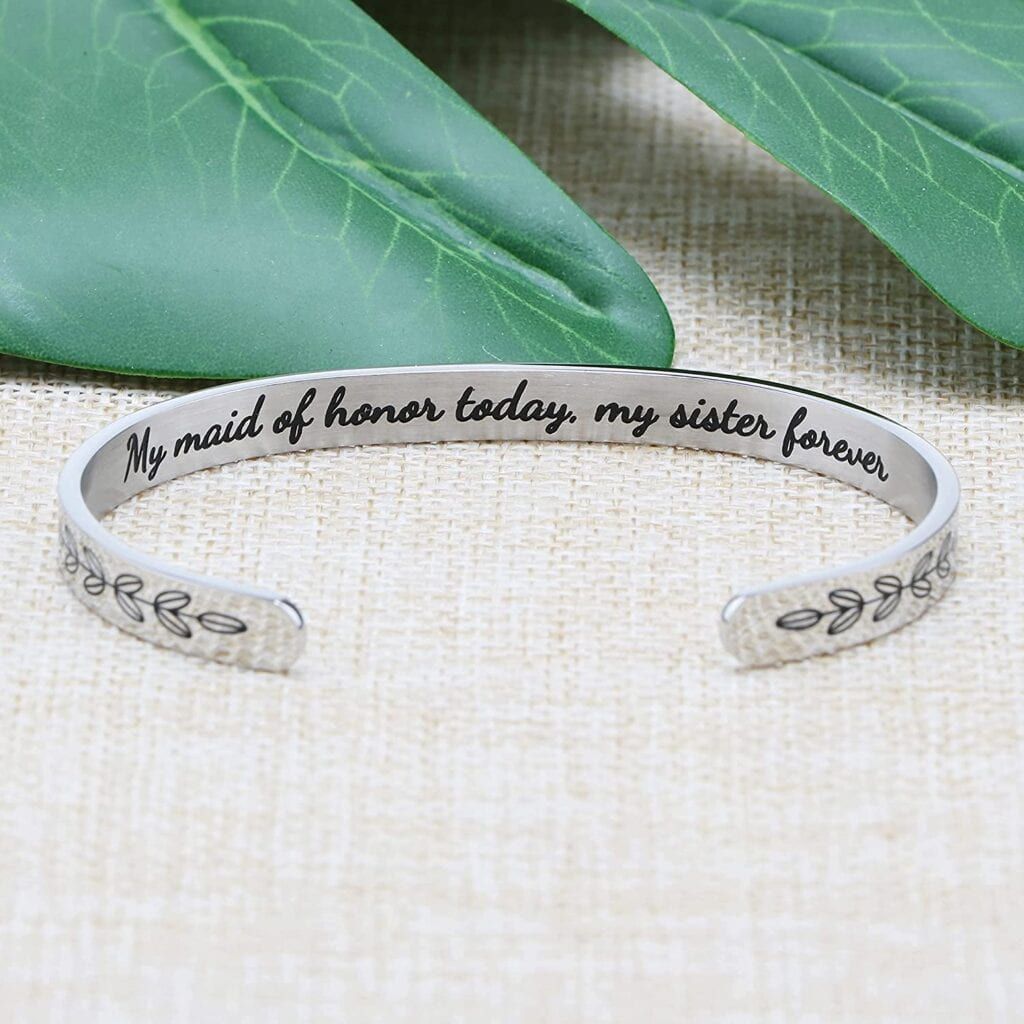 The most thoughtful gifts are the ones they can use and reuse hundreds, if not thousands, of times. This stainless steel open bangle has a lovely leaf design on the outside with a hidden message, “My maid of honor today, my sister forever,” on the inside. (You can choose from other messages as well.) It’s a hidden note of a shared secret between you and your closest friends.