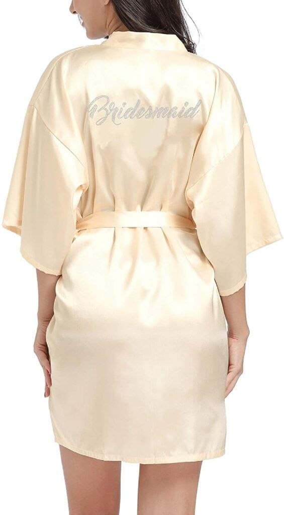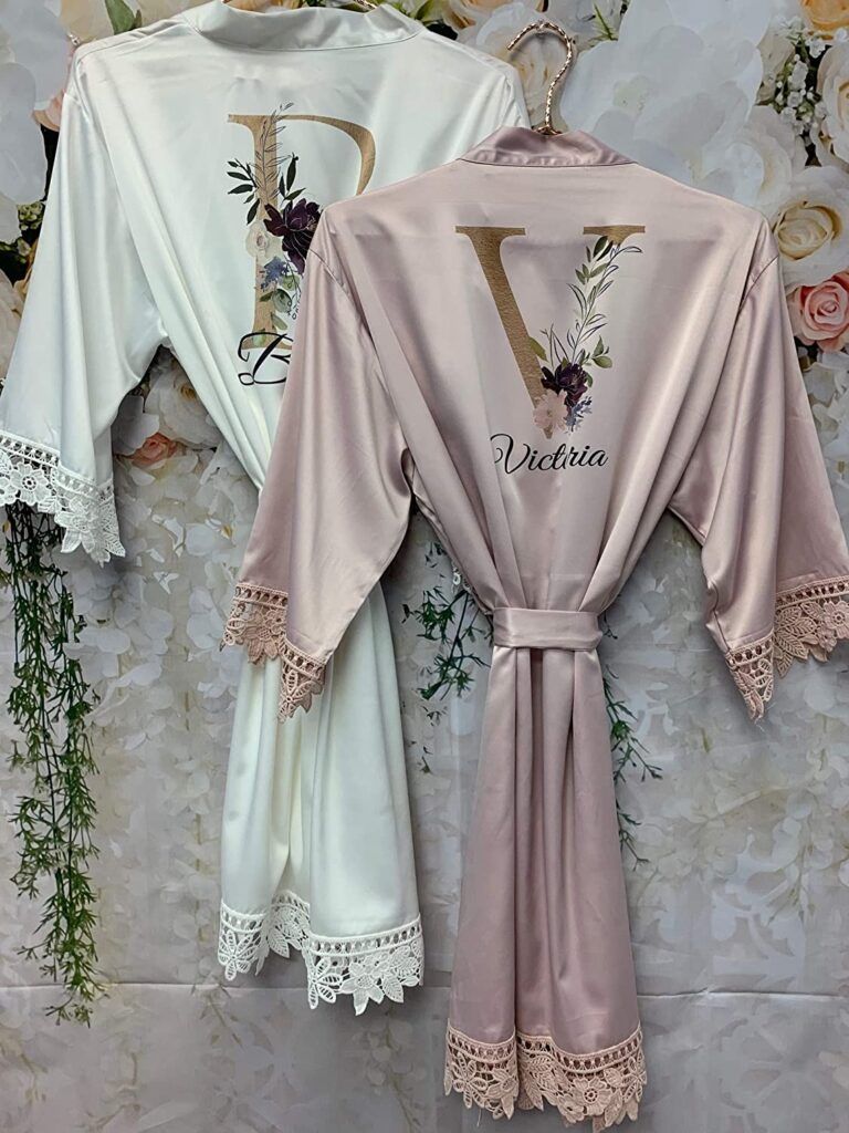 We’re going to discuss a personalized robe option later but this satin, rhinestone-adorned version is a budget-friendly choice with a variety of word choices. Soft and comfortable, this features lightweight fabric and a tie closure. These come in two sizes to accommodate sizes up to XXL. Choose from options that include “bride,” “bridesmaid,” “maid of honor,” “mother of the bride,” “matron of honor,” and “mother of the groom” versions.