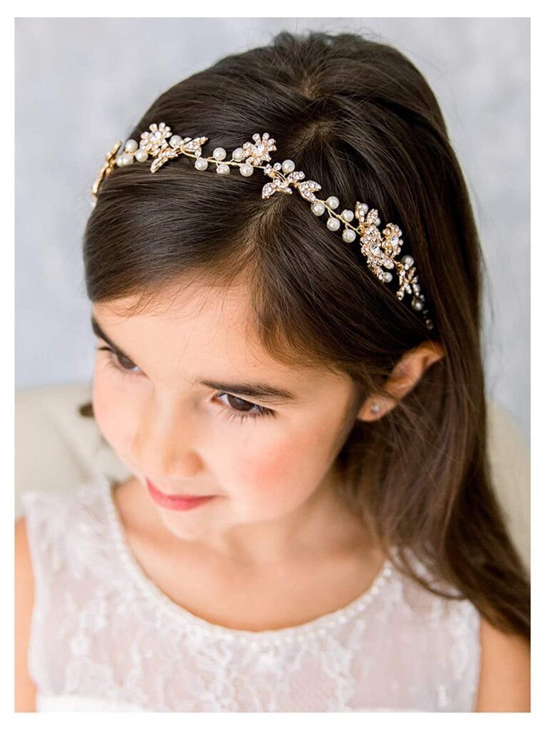 I hate going to weddings but the absolute best parts are when the flower girl and ring-bearer make their appearance. Help them feel extra special with this headpiece that’s adorned with crystal dew-dropped blossom and leaves, dainty pearl and crystal buds. It’ll be her new favorite hair accessory long after your big day is over. A soft, adjustable ribbon won’t hurt her head and stays in place.