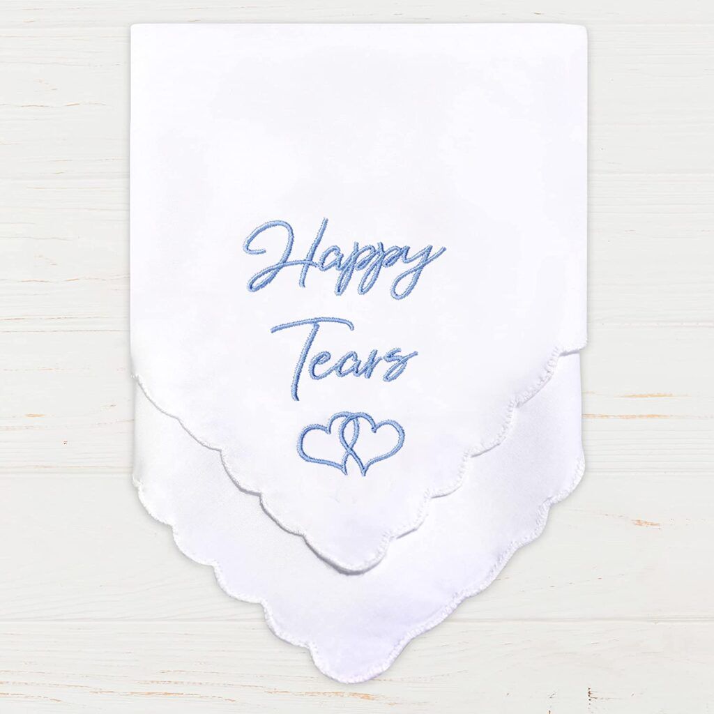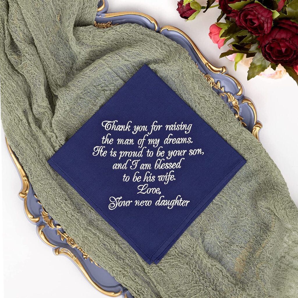Do fathers-in-law cry at weddings? I don’t feel like they do but they might after reading the beautiful message on this navy embroidered handkerchief. Presented in a 12 by 12-inch size made from 100 percent cotton, this hankie is navy and has white embroidery, not printing. This is also available in a “father” version for your own dear ol’ dad.