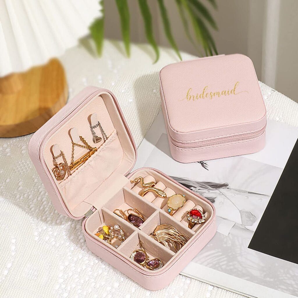 I actually own this zippered jewelry box and I can attest to how great it is, whether they’re using it at home or on the road. Mine isn’t printed with the word “bridesmaid” on the top but that adds a nice element. They’ll appreciate the various compartments for rings, necklaces, charms and more. (And, yes, you’ll get one, too, in white with “bride” printed on it.)