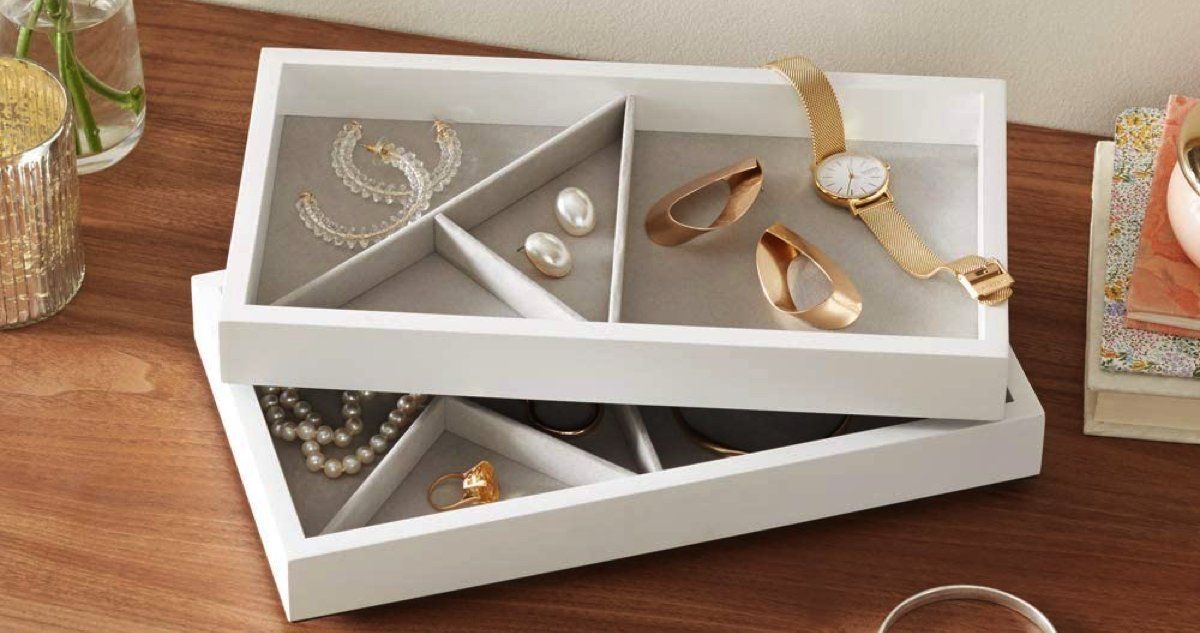 For less than $15, you can get two of these stackable jewelry trays that are great for cufflinks, hair clips, rings, earrings, and more. Each one is made from durable wood with an adorable painted finish, and they look great on any vanity, or even on your bedroom nightstand.