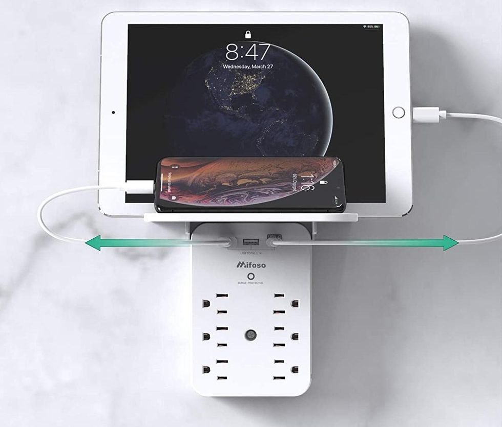 Professional surge protection at an affordable price. Make short-circuiting wires and plugs a thing of the past with this six-channel plus USB outlet charger with a shelf.
