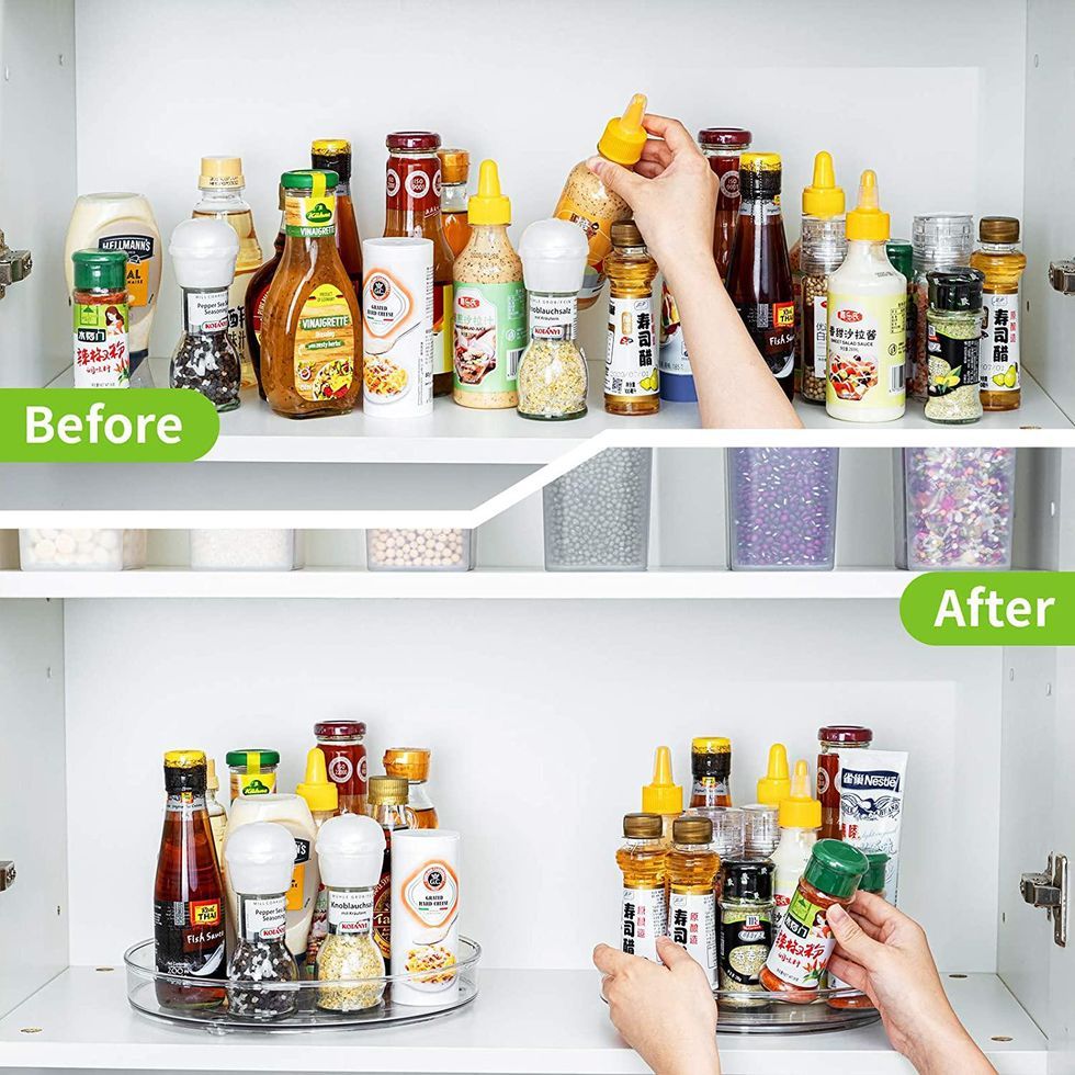This two-story clear lazy Susan rack makes the most of the limited space in your kitchen cabinets, leaving you more room for the snacks you really love.